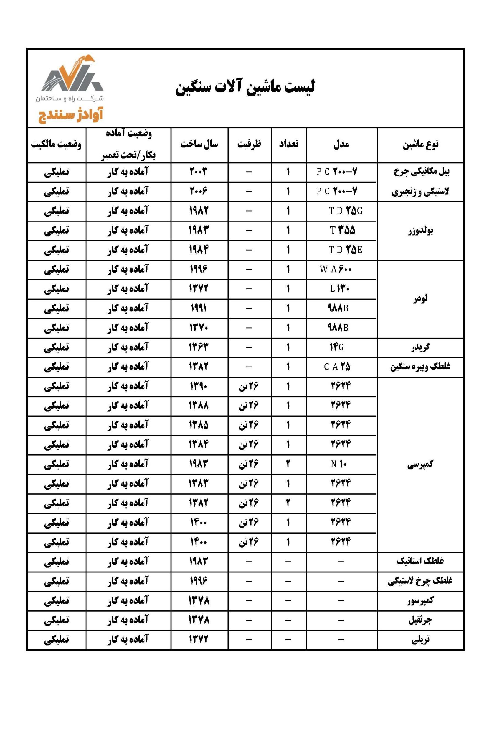 لیست ماشین آلات سنگین شرکت راه و ساختمان آوادژ سنندج