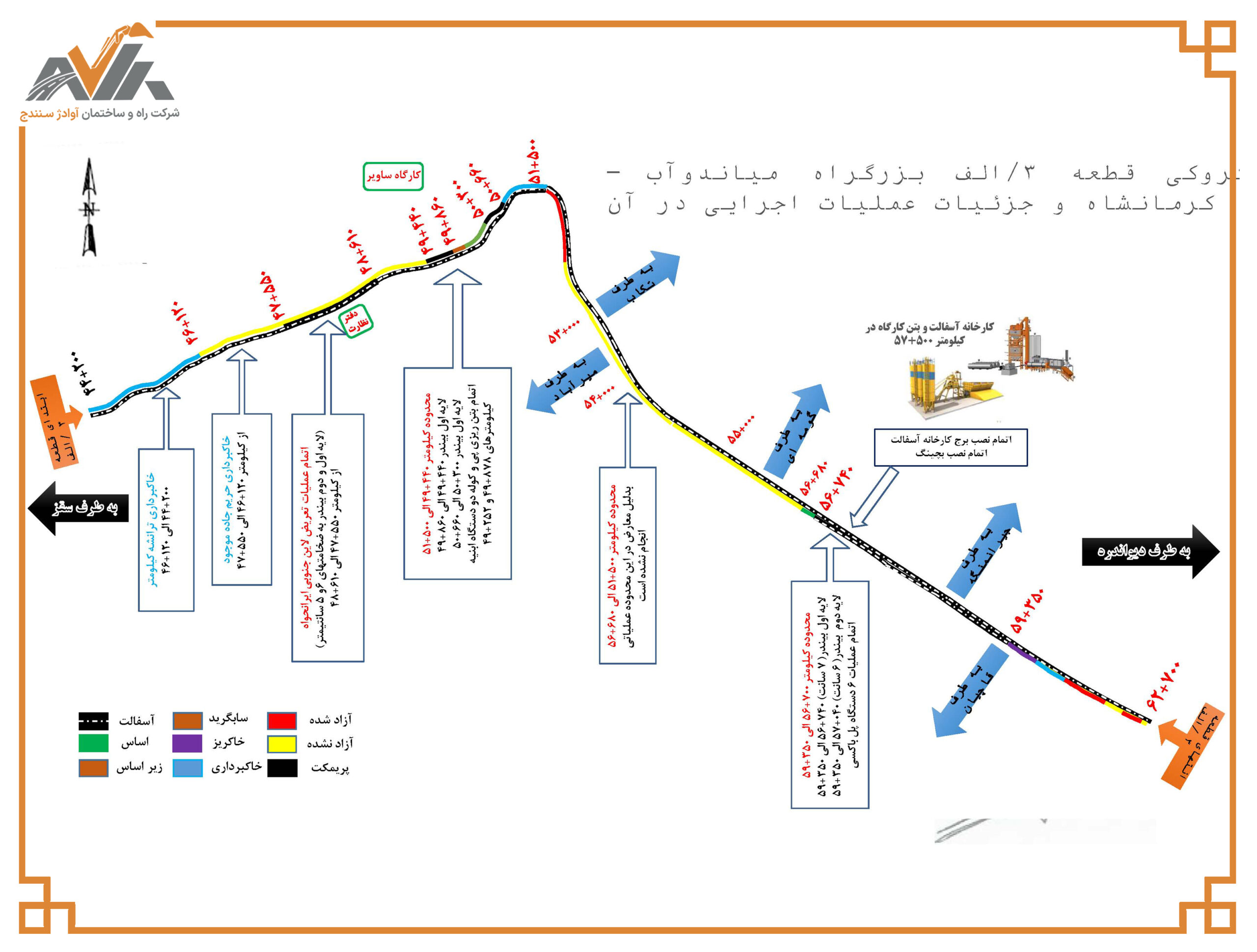عبارتست تکمیل عملیات اجرایی باند دوم قطعه ۳ الف بزرگراه میاندوآب – کرمانشاه حد فاصل كيلومتر ١٢٥٠٠٠٠ الى ۱۴۳۰۵۰۰ مطابق نقشه های تیپ و پروفیلهای طولی و عرضی منضم به دفتر چه نقشه ها شامل: تکمیل عملیات خاکبرداری، خاکریزی معمولی و سنگی احداث ابنیه مسیر و اجرای روسازی شامل دولایه زیر اساس به ضخامت هر لایه ۱۵ سانتی متر مجموعا ۳۰ سانتیمتر یک لایه اساس به ضخامت ۱۵ سانتیمتر دو لایه آسفالت بیندر ۲۵ — لایه اول به ضخامت ۱ سانتیمتر، لایه دوم به ضخامت ۵ سانتیمتر و آسفالت رویه توپکا ۱۹ به ضخامت 1 سانتیمتر اجرای حفاظ گاردریل و نیوجرسی خط کشی تابلو علائم در طول ۱۸.۵ کیلومتر.